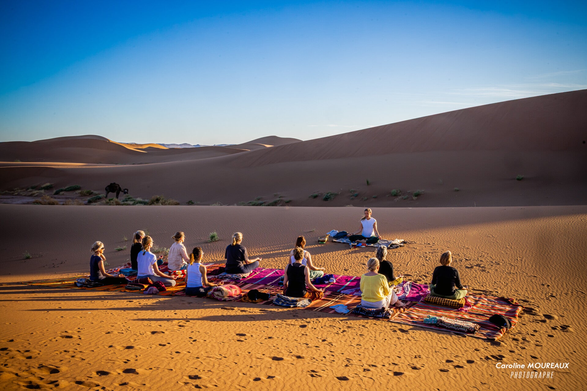 Pratique de Yoga pour se défaire de la journée de transport et première nuit dans le désert sous les grandes tentes berbères partagées ou bien à la belle étoile.