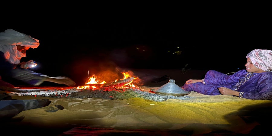 Après le petit-déjeuner, nous repartons pour une marche de 3 heures au rythme de la caravane, direction Erg Zmila, proche de la frontière algérienne. Les paysages, entre montagnes et dunes, ne manqueront pas de vous époustoufler. Nous passerons la nuit ici, où vos guides vous prépareront un des délicieux repas dont eux seuls ont le secret, accompagné de leur fameux pain de sable. Laissez vous envoûter par leurs chants et leurs histoires au coin du feu.