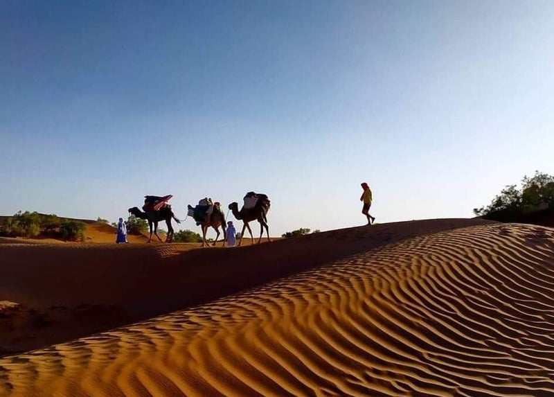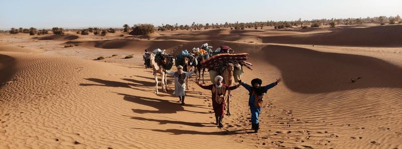 - Arrivée au village de M'Hamid El Ghizlane en milieu de journée, rencontre de l'équipe de guides nomade et départ à pied vers le désert.